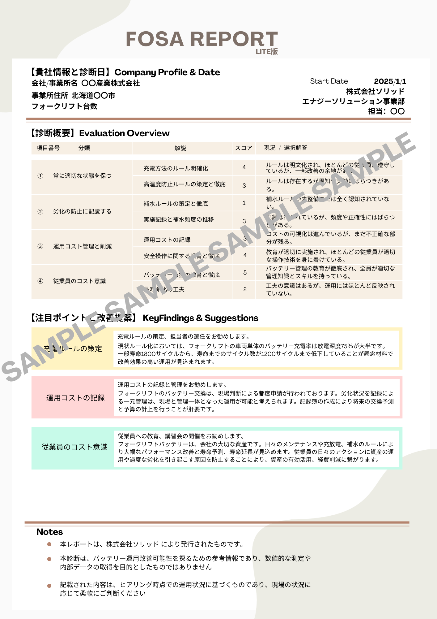 充電・放電・補水・管理状況を客観的に確認し、 現状と課題を整理するのがFOSA診断です。