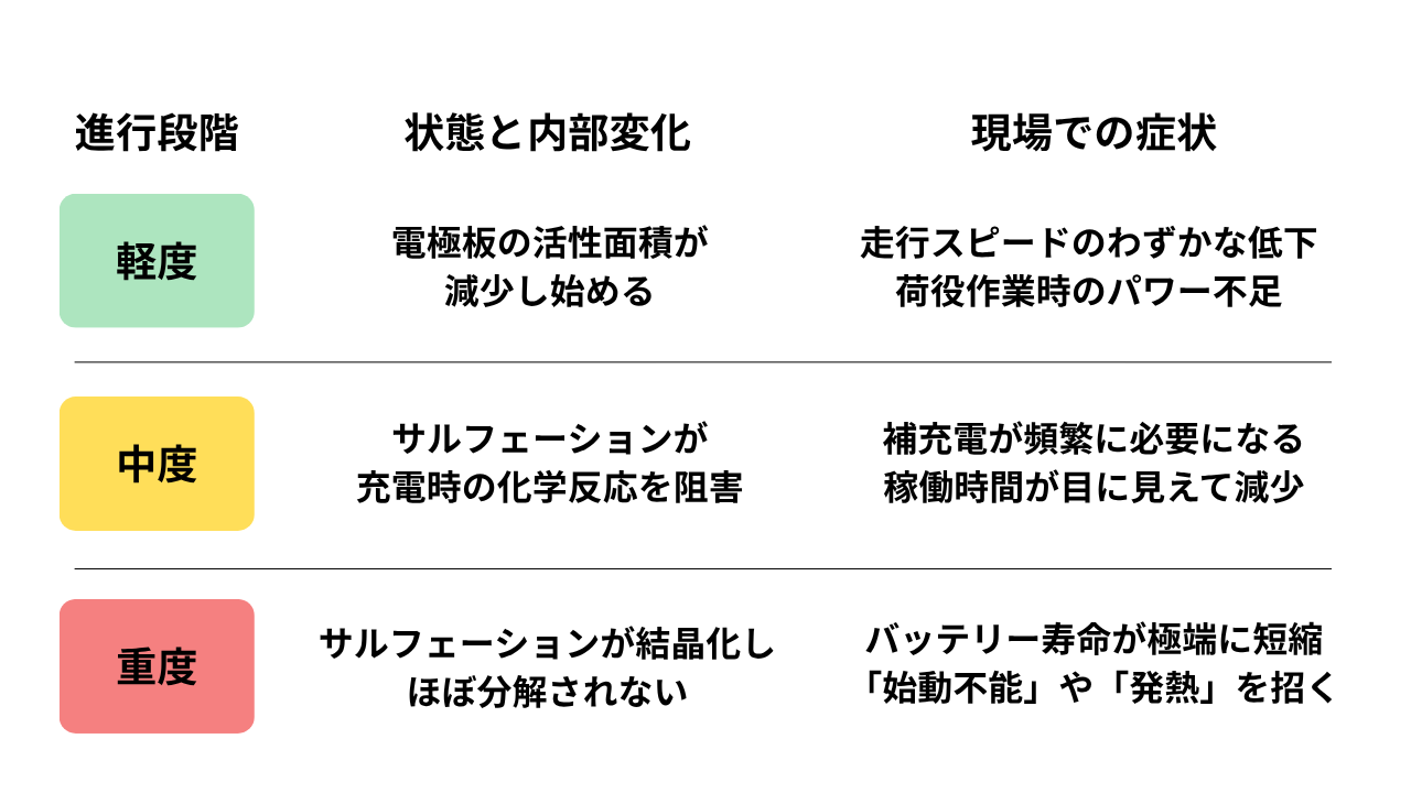 サルフェーション劣化は、進行度合いによって現場で以下のような具体的な症状として現れます。