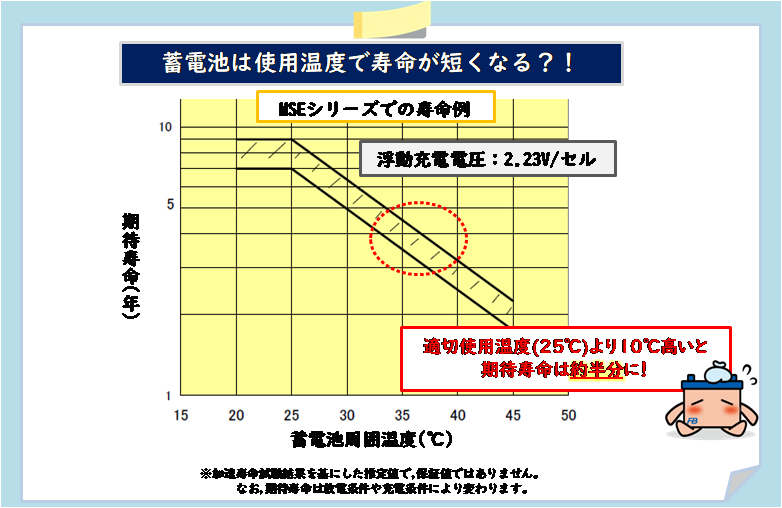 鉛バッテリーの一般的な特性として温度が10℃上昇すると、劣化進行スピードが2倍になると言われています。