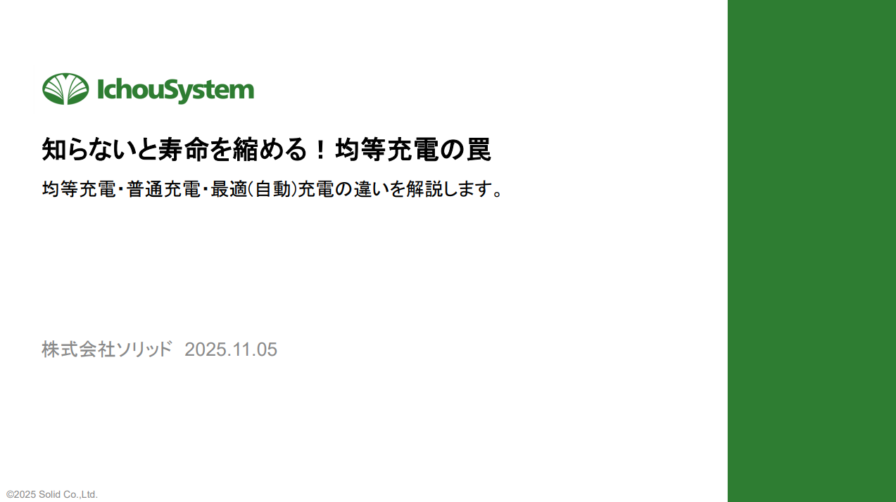 資料ダウンロード 知らないと寿命を縮める!均等充電の罠 バッテリー延命サービス「IchouSystem」にご興味いただき誠にありがとうございます。 こんな方におすすめです フォークリフトのバッテリー交換コストを削減したい管理者の方 現場で“均等充電の頻度”や“適切な充電方法”に迷っている方 車両ごとに最適な充電ルールを整備し、現場の運用を標準化したい方 お名前 必須 会社名 必須 メールアドレス 必須 電話番号 必須 個人情報は、プライバシーポリシーに基づき厳重に管理いたします。