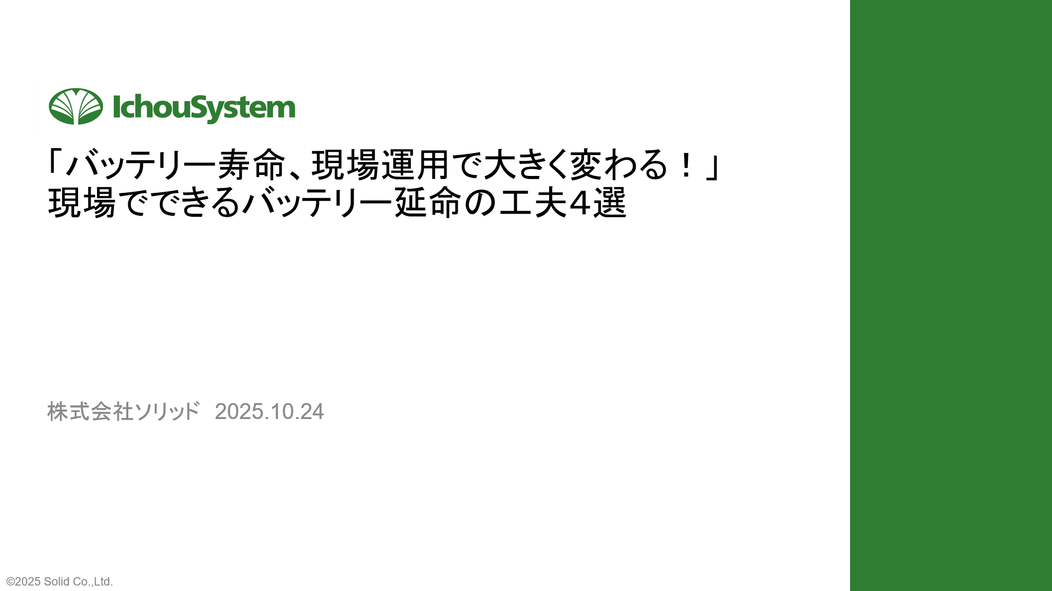 資料ダウンロード 現場でできるバッテリー延命の工夫4選 バッテリー延命サービス「IchouSystem」にご興味いただき誠にありがとうございます。 こんな方におすすめです バッテリー交換コストに課題を感じている方 現場でできる省コスト・延命対策を、すぐに実践したい方 オペレーター任せの運用をルール化・標準化したいと考えている方 お名前 必須 会社名 必須 メールアドレス 必須 電話番号 必須 個人情報は、プライバシーポリシーに基づき厳重に管理いたします。