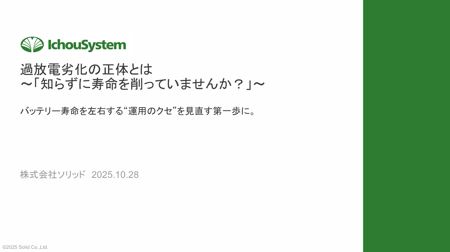 資料ダウンロード 過放電劣化の正体とは バッテリー延命サービス「IchouSystem」にご興味いただき誠にありがとうございます。 こんな方におすすめです フォークリフトのバッテリー寿命が短いと感じている方 現場の充電ルールや運用方法を見直したい管理者の方 過放電によるコスト増加を防ぎたい経営・設備担当者の方 お名前 必須 会社名 必須 メールアドレス 必須 電話番号 必須 個人情報は、プライバシーポリシーに基づき厳重に管理いたします。
