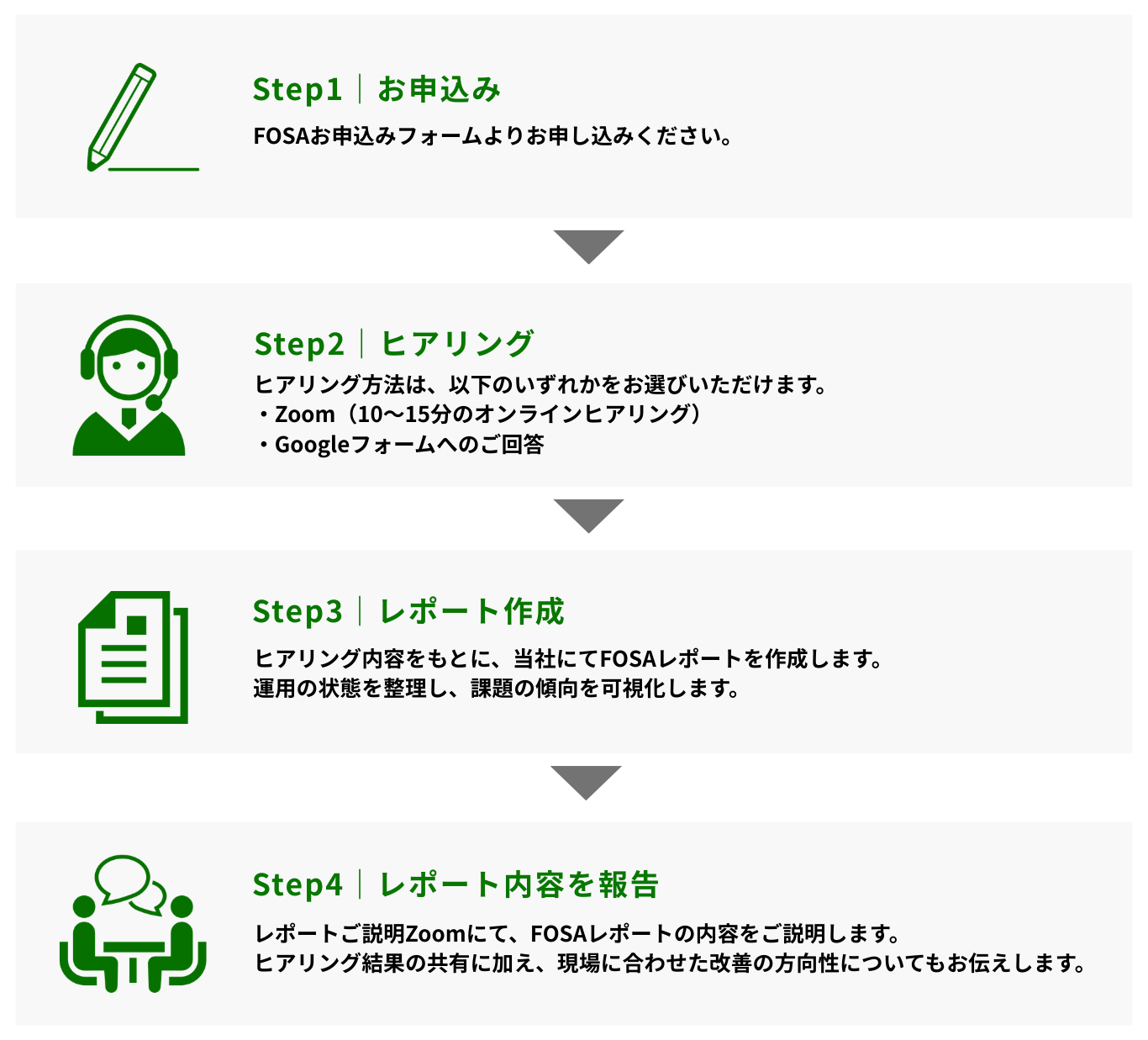 FOSAでは、「なぜそうなっているのか」「どこでズレが生まれているのか」を 構造として整理することを重視しています。 現場の工夫や良い運用はそのまま評価し、 改善が必要な点も「責任」ではなく「仕組み」の問題として整理します。 そのため、管理者・オペレーター双方が 「納得して前に進める内容」になるよう設計しています。