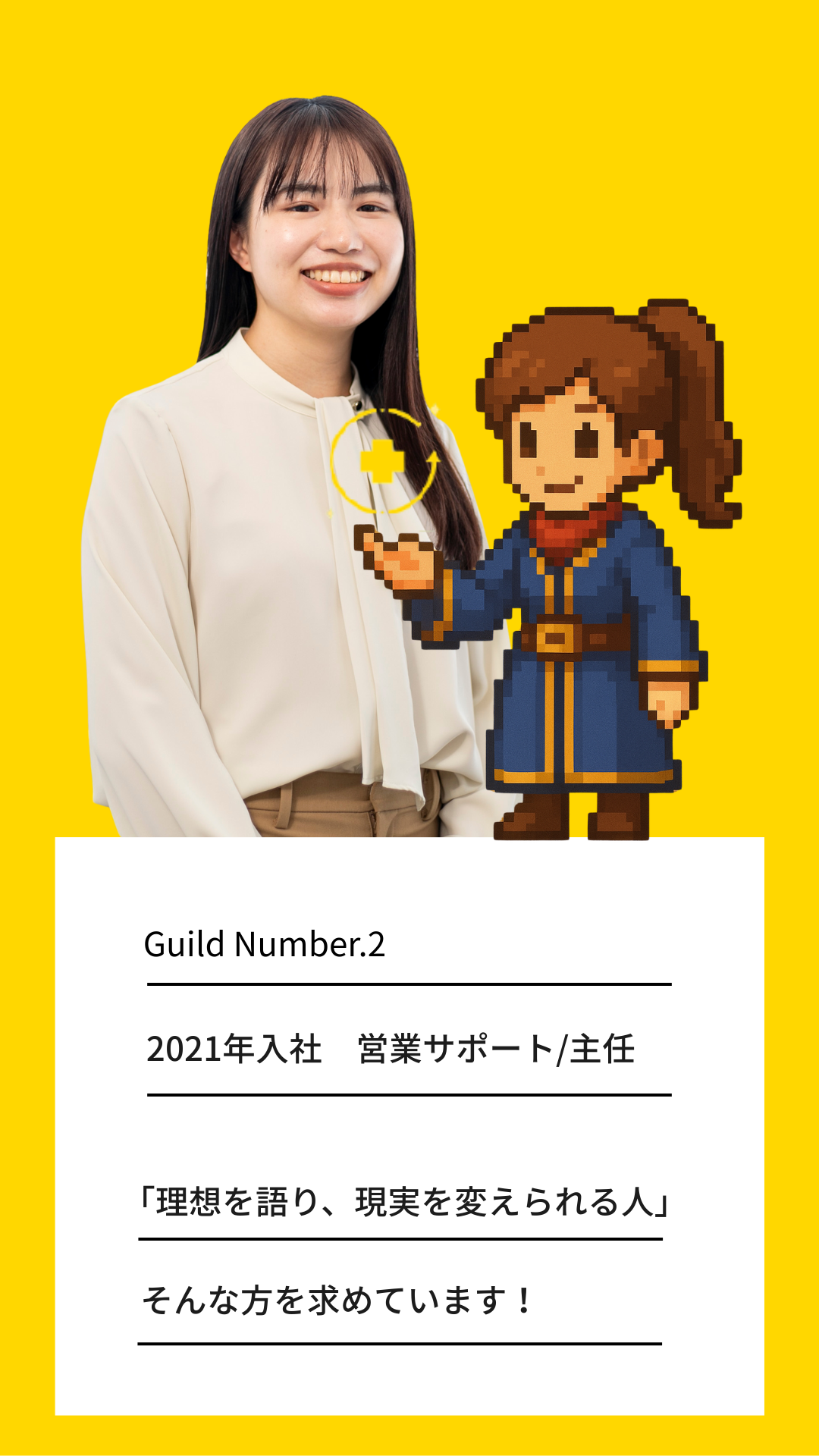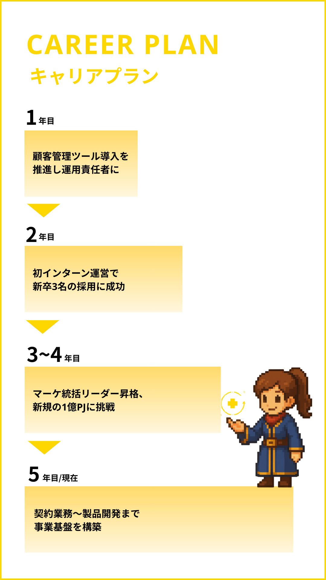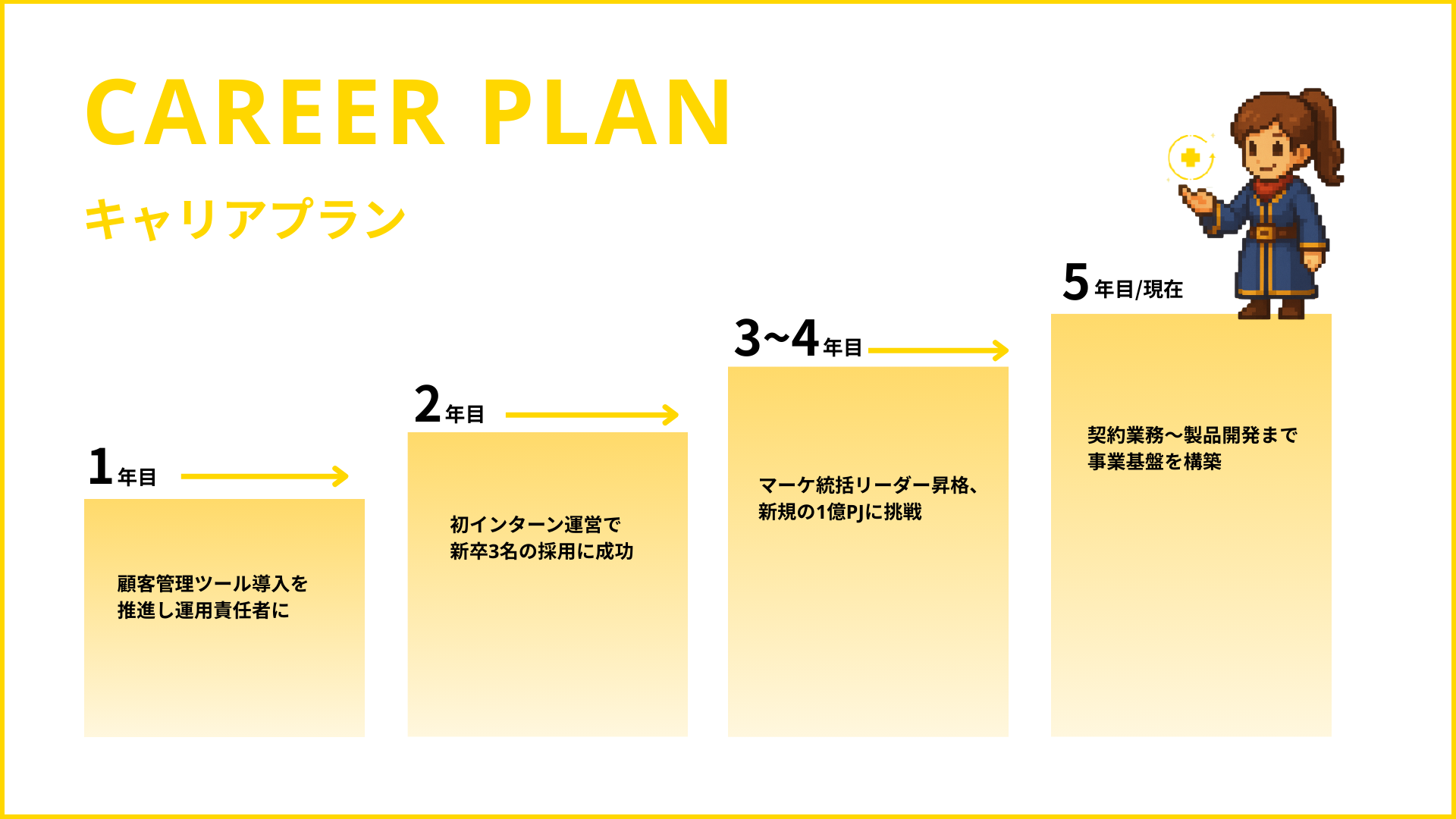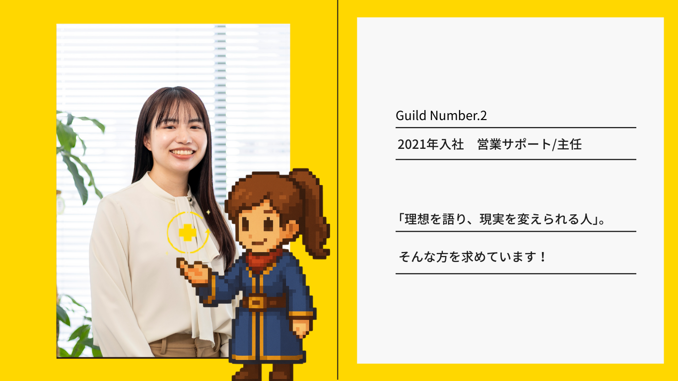 サポート職は客観的に営業現場の課題を見られる立場だと思います。この立場を活かして、業務改善や仕組みづくりに携わり、全社的な効率化に貢献するキャリアを描いています。営業とは少し違う目線だからこそ気づける課題も多くあり、新人の営業担当者でも1年目から一定以上の成果を出せる仕組みづくりに貢献をしたいです。また、営業担当者の成功事例をまとめ社内共有することで、各営業担当者の発見や気づきを与えるきっかけづくりであったり、新人教育に活かせる営業ノウハウを提供することで、新人教育にも貢献したいです。